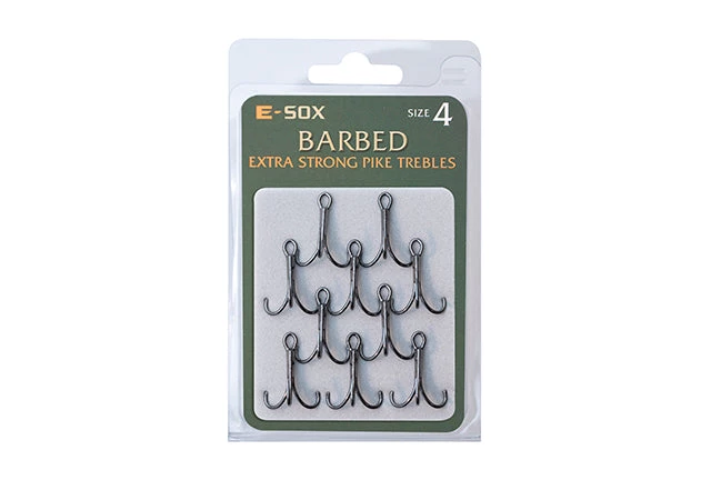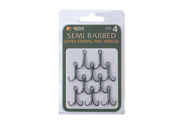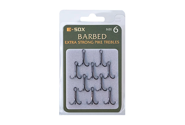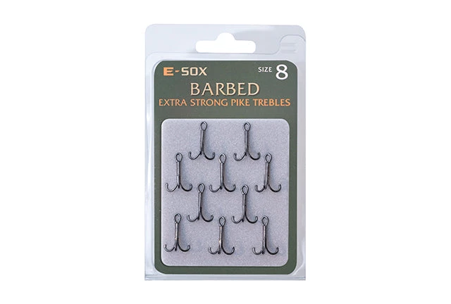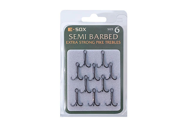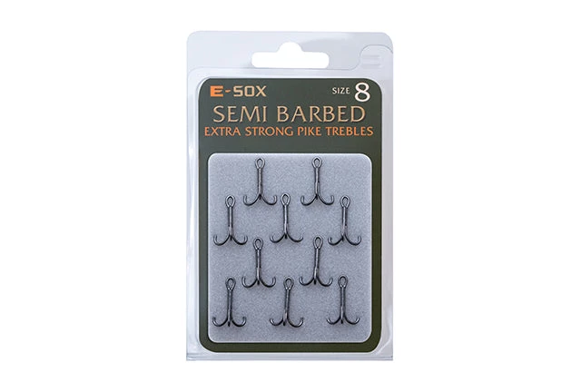 E-Sox Extra Strong Trebles are available in the three most effective and popular sizes 4s, 6s and 8s and in both Barbed and Semi Barbed versions.
