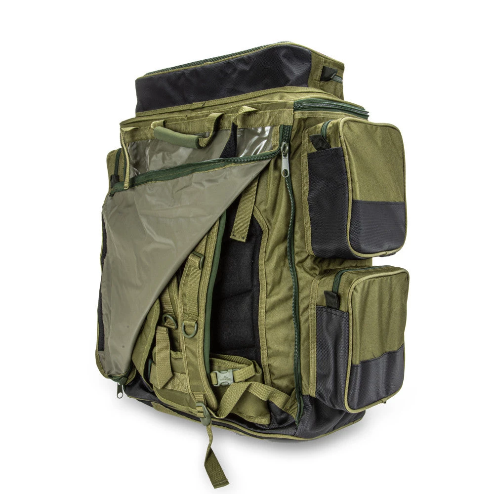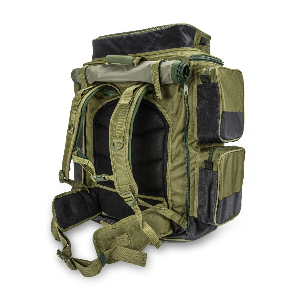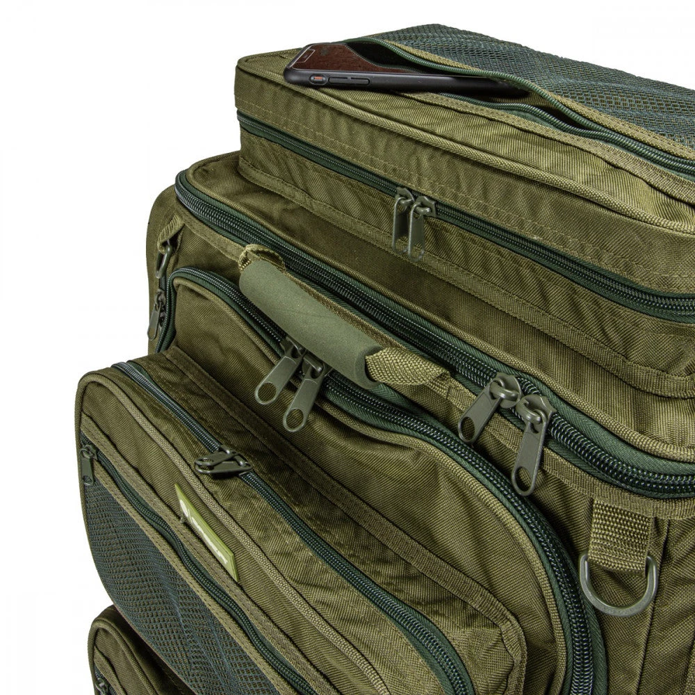 Designed with space saving and total manageability in mind. A large front compartment zipped cover opening up the front of the rucksack makes access and managing your gear simple. It can also be stored under a bed chair making the most of your bivvy space. A zipped opening on the top of the rucksack also gives you access when stood upright. Designed with six large deep external pockets custom designed with mesh stash pockets. Three Neoprene carry handles placed conveniently around the rucksack making transporting the rucksack when fully loaded easy. A built in keep clean PVC rucksack cover will protect the rucksacks fully adjustable padded neoprene chest and waist harness when laid flat.